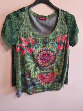 Camisa de manga corta con un diseño vibrante y detallado. - Estampado floral y mandala. - Detalles en pedrería. - Mangas con estampado de encaje. - Cuello redondo.