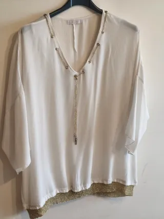 Elegante camisa italiana de talla M con un llamativo diseño. - Detalle de cadena dorada en el escote. - Acabado brillante en el bajo.