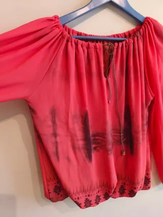 Camisa de manga larga con un diseño bordado en el frente y las mangas. Muy favorecedora y ponible -Es una XS pero sirve para una S también. -Cuello redondo. - Cierre en la parte trasera del cuello.