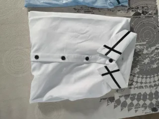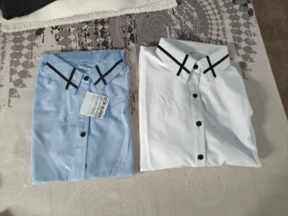 Dos camisas de mujer, una azul y otra blanca, ambas en talla S/M. Perfectas para un look casual o formal Precio unitario unitario - Diseño con cuello - Cierre de botones - Detalle de cintas negras en el cuello