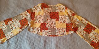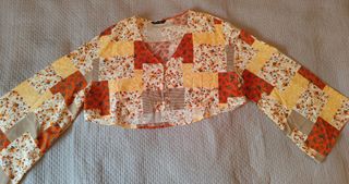 Camisa corta con un diseño de flores y detalles en naranja y amarillo. Presenta un escote en V y mangas acampanadas. Talla L de Shein. Sin estrenar, aunque sin etiqueta.