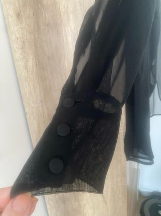 Elegante camisa negra de fiesta con detalles decorativos en raso Espalda 46cm.Largo total 87cm.Largo manga 60cm.Contorno pecho 120cm. - Diseño con volantes verticales en la parte delantera. - Tejido ligero y transparente. - Cuello camisero. - Cierre de botones.