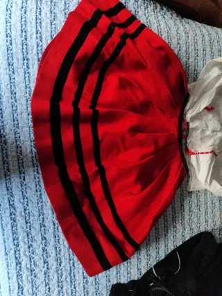Conjunto tradicional asturiano. - Falda roja con detalles negros. - Camisa blanca con adornos rojos.