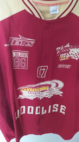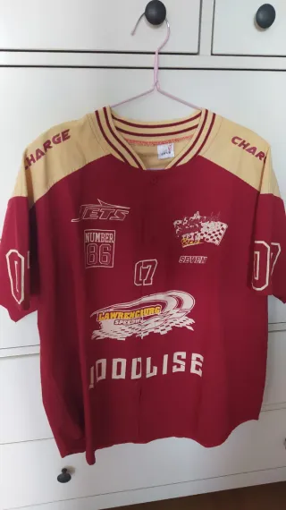 Camisa oversize con un diseño llamativo y deportivo. - Mangas cortas. - Cuello redondo con detalles a rayas. - Estampados gráficos inspirados en carreras. - Hip hop.