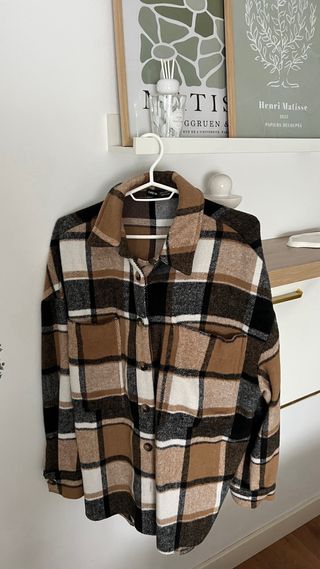 Camisa gruesa de cuadros con corte oversize. - Diseño a cuadros en tonos marrones, negros y blancos. - Bolsillos frontales. - Cierre de botones.