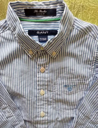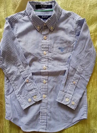 Camisa de manga larga para niño de la marca Gant. Presenta un diseño de rayas verticales en tonos azules y blancos, con cuello abotonado. - Cuello abotonado. - Bolsillo en el pecho con logo. - Puños con botones.