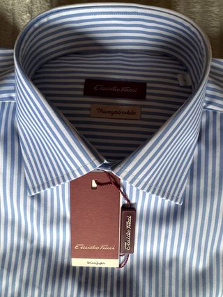 Camisa de vestir de la marca Emidio Tucci, con un diseño de rayas verticales en tonos azul y blanco. Es una prenda elegante y versátil. - Cuello clásico. - Cierre de botones. - Bolsillo en el pecho. - Puños abotonados.