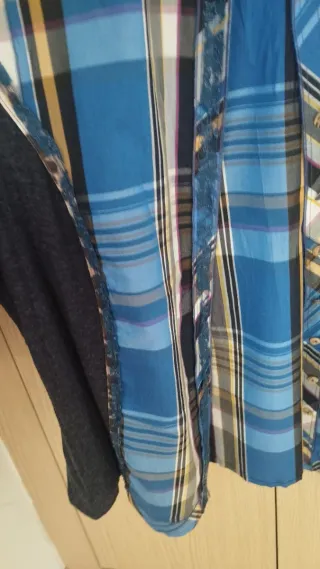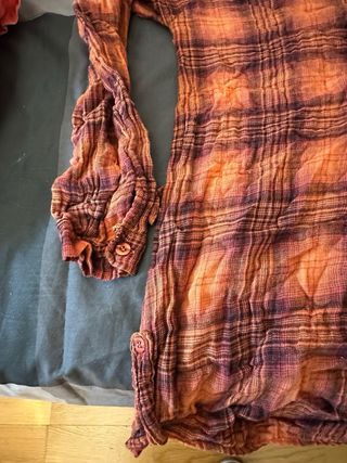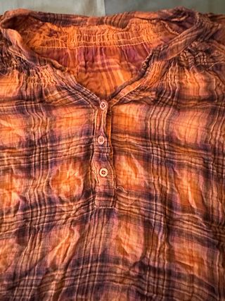 Camisa con estampado a cuadros en tonos naranjas y morados. Presenta un diseño con cuello y botones. - Cuello con fruncido. - Cierre de botones en la parte delantera. 6 euros las dos