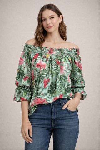 Camisa de Mango con un bonito estampado floral y rayas verdes. Es talla M y se encuentra en perfecto estado. Regalo otra camisa o vestido por el mismo importe. - Diseño de hombros descubiertos. - Mangas abullonadas con detalle. - Tejido ligero y fresco.