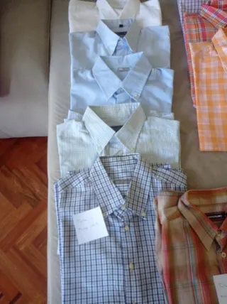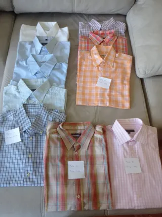 Conjunto de camisas de manga corta y manga larga para caballero. Incluye camisas de diferentes colores y estampados. - Camisa azul claro. - Camisa a cuadros azul y blanco. - Camisa a cuadros verde y blanco. - Camisa blanca. Talla L y M Precio unidad