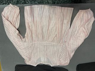 Camisa sin estrenar, de la marca El Pulpo, de manga larga con un diseño de rayas finas y detalles brillantes que le dan un toque especial. La parte del pecho tiene un fruncido elástico. - Diseño de rayas finas. - Tejido ligero con hilos brillantes. - Fruncido elástico en el pecho. - Mangas abombadas con goma en el puño.