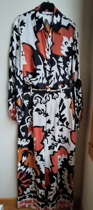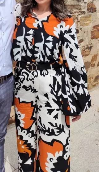 Conjunto de camisa y pantalón de Zara con un llamativo estampado en color naranja y negro - Camisa con mangas abullonadas talla S, overside - Pantalón de estilo pallazo, talla M Se ha usado solo en 2 ocasiones Se vende junto o por separado