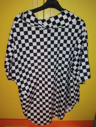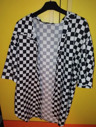 Camisa con estampado de cuadros en blanco y negro. Diseño abierto con botones. - Manga corta. - Cuello camisero.