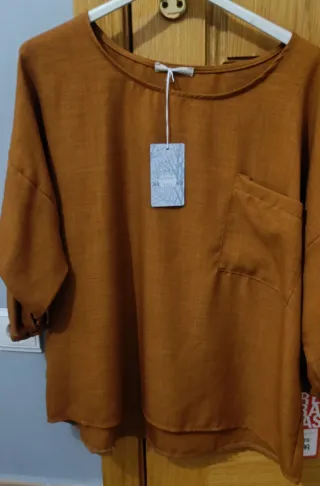 Camisa con etiqueta, lista para estrenar. - Diseño de talla única. - Color marrón anaranjado.