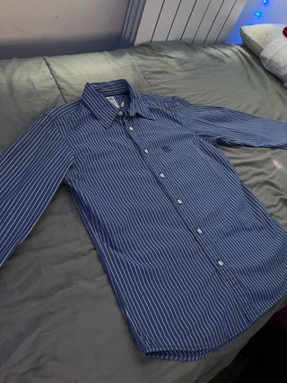 Camisa vintage azul con rayas blancas en muy buen estado. Diseño clásico de manga larga, cuello tradicional y cierre con botones blancos. Lleva detalle bordado en el pecho que le da un toque elegante y distintivo. Es una prenda atemporal, fácil de combinar tanto para looks formales como casuales. Ideal para quienes buscan estilo retro con personalidad. Estado: Muy buen estado, bien cuidada. Talla: (S de chico) Precio negociable.