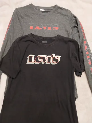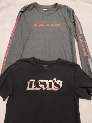 Conjunto de dos camisas Levi's, una de manga larga y otra de manga corta. Ambas presentan el logo de la marca. - Camisa de manga larga gris con logo en el pecho y detalle en las mangas. - Camisa de manga corta negra con logo en el pecho.