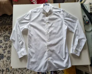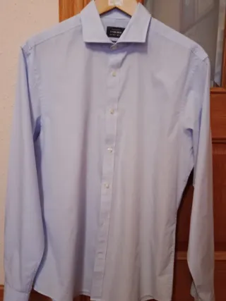 Camisa premium de hombre modelo Pelle. Aspecto sofisticado y elegante. Cuello italiano, 100% algodón. La talla es 42, pero queda estrecha, ya que el corte es slim (ver medidas en fotos). Nunca usada.