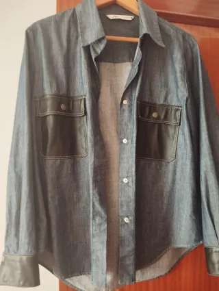 Camisa vaquera de Zara con un diseño moderno y detalles en polipiel. - Bolsillos delanteros con solapa y botón. - Puños con acabado en polipiel. - Cierre de botones a presión.