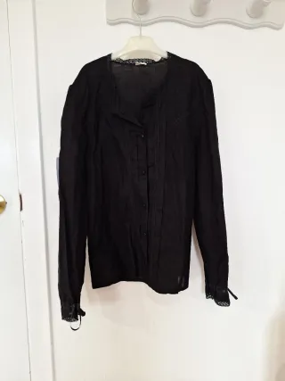 Camisa de estilo baturra. - Llevada solo 1 vez. - Cuello redondo con detalle de encaje. - Cierre de botones en la parte delantera. - Mangas largas con puños adornados con encaje y lazo. - Adornos de encaje en la parte frontal.