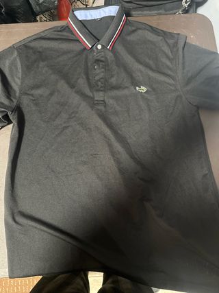 Camisa tipo polo de la marca Lacoste en color negro. Presenta un diseño clásico con cuello y detalles en contraste. - Logo de cocodrilo bordado en el pecho. - Cuello con ribete a rayas rojas y blancas. - Cierre de botones en la parte frontal.