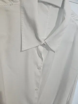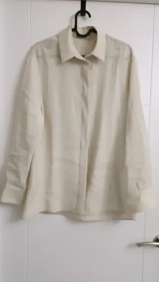 Camisa de tela fluida con botones. - Holgada de mezcla de modal y poliéster con cuello. - Mangas largas con puños. - Botones en la espalda. - Cierre de botones bajo la tapera - Color: crudo - Talla: S ( Da mucha talla). - Largo: 71 cm - Ancho sisa: 53 cm. En perfecto estado. Usada una sola vez. En Zaragoza, recoger en zona Delicias o centro