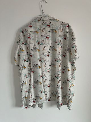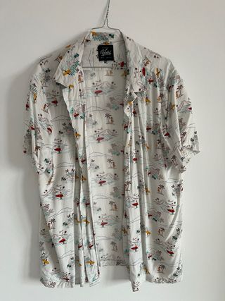 Camisa de manga corta con un divertido estampado tropical. - Diseño con palmeras, surfistas y montañas. - Cuello camisero clásico. - Cierre de botones.