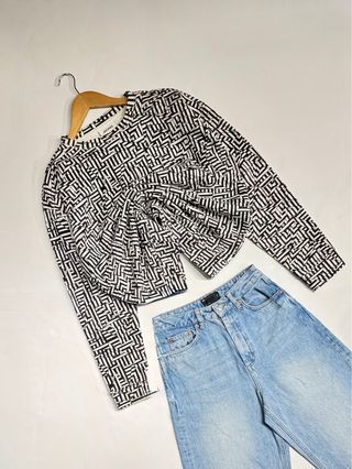 Camisa de manga larga con un llamativo estampado geométrico en blanco y negro. Presenta un diseño cruzado con un nudo frontal que le da un toque moderno y elegante. - Diseño cruzado con nudo frontal. - Estampado geométrico. - Manga larga.