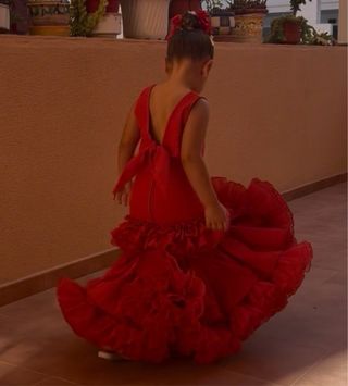 Conjunto de dos vestidos de flamenca, uno para adulto y otro para niña, ambos de color rojo. - Diseño con volantes. - Adornos florales en la cabeza. - Ideal para fiestas y eventos.
