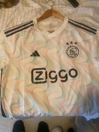 Camiseta oficial del Ajax con un diseño moderno y llamativo. - Diseño multicolor sobre base blanca. - Logo de Adidas y escudo del Ajax. - Patrocinador Ziggo en el frontal.