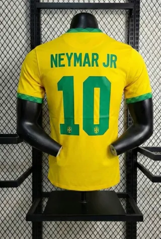 Camiseta de fútbol de Brasil con el número 10 y el nombre de Neymar Jr. - Diseño icónico de la selección brasileña. - Detalles en verde en cuello y mangas.