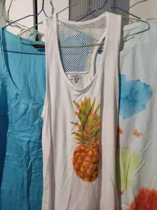 Conjunto de varias camisetas sin mangas con diferentes diseños. Vsrisdas - Camiseta roja lisa. - Camiseta blanca con degradado azul. - Camiseta azul lisa. - Camiseta blanca con estampado de piña. - Camiseta con estampado abstracto multicolor. - Camiseta a rayas rojas y blancas.