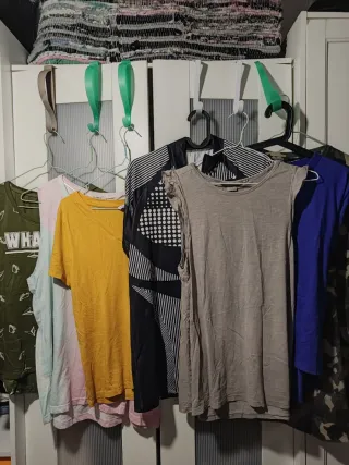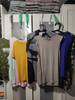 Conjunto de siete camisetas de diferentes estilos y colores.tejidod - Camiseta verde con estampado. - Camiseta rosa y azul degradado. - Camiseta amarilla de manga corta. - Camiseta negra con estampado geométrico. - Camiseta gris sin mangas. - Camiseta azul. - Camiseta con estampado de camuflaje.