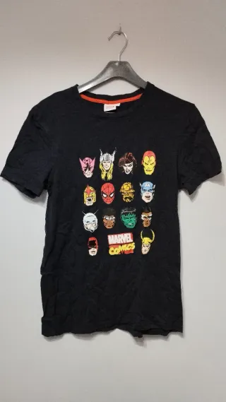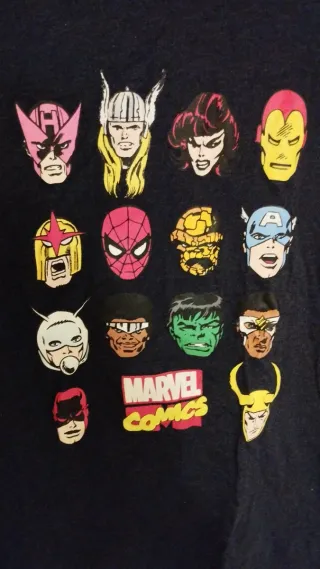 Camiseta negra con estampado de los personajes clásicos de Marvel Cómics. - Estampado de varios personajes icónicos. - Logo de Marvel Comics. Si tienes dudas de cualquier cosa del artículo, no dudes en preguntarme (medidas, más fotos,...). Puedes mirar mi perfil por si hay algo que te pueda interesar y así solamente pagas un envío. Precio negociable