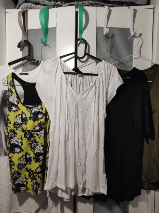 Conjunto de cinco camisetas variadas.estilod - Camiseta blanca con cordones. - Camiseta de tirantes con estampado floral. - Camiseta negra. - Camiseta verde militar.