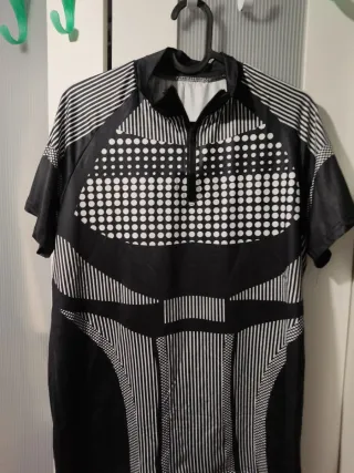 Camiseta de licra con un diseño moderno y llamativo. - Diseño unisex. - Estampado gráfico en blanco y negro. - Cuello redondo con cremallera corta.