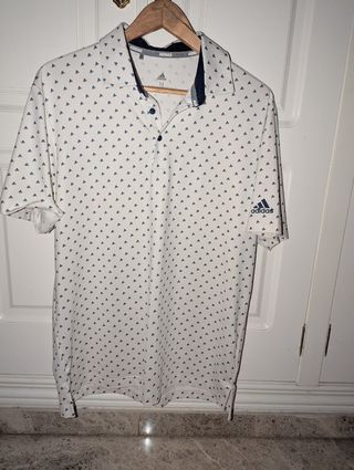 Polo de manga corta con un diseño moderno y llamativo. NO COMPRAR, NO VALE 1€. - Pone talla M pero es bastante grande yo diría mínimo una L. - Estampado de pequeños logos de adidas en azul. - Cuello tipo polo con botones. - Logo de Adidas en la manga. - Material principal poliéster.