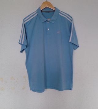 Vendo polo Adidas de color celeste. Está en buen estado. - Talla: (Añadir talla) - Tiene dos rayas blancas en las mangas.