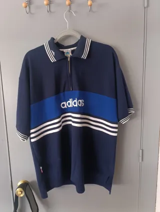 Polo deportivo de Adidas con un diseño moderno y llamativo. - Cuello tipo polo con cremallera. - Banda azul en el pecho con logo. - Rayas blancas en cuello y mangas.