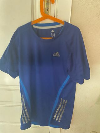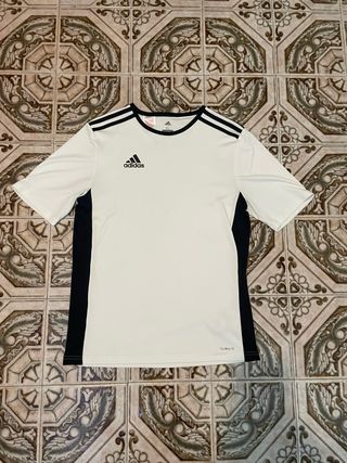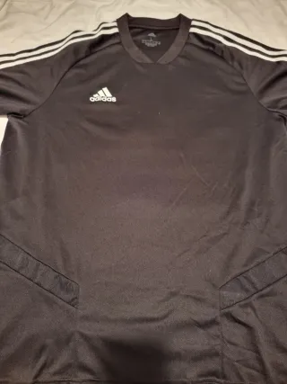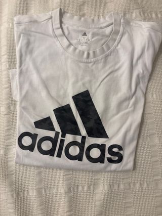Camiseta deportiva de manga corta con el logo de Adidas. - Diseño con las tres rayas icónicas en los hombros. - Tejido transpirable para mayor comodidad. - Cuello redondo.