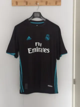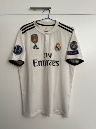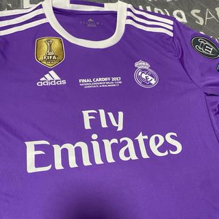 Camiseta de fútbol del Real Madrid, edición especial. - Diseño conmemorativo de la final de Cardiff 2017. - Parches de la Champions League y FIFA. - Logo de Fly Emirates en el frontal.