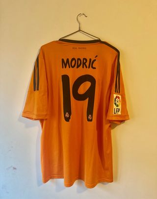 Camiseta original del Real Madrid de la temporada 2013/2014, con el dorsal 19 de Luka Modric. - Diseño con detalles en negro. - Escudo del Real Madrid. - Logo de la LFP en la manga. Único desperfecto en la parte frontal de la camiseta, poco visible