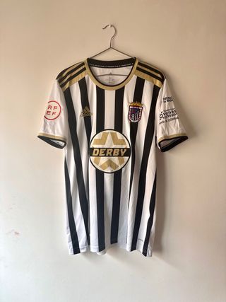 Camiseta de fútbol del Badajoz de la temporada 2021/2022. - Diseño a rayas verticales blancas y negras. - Detalles dorados en hombros y logo. - Escudo del club en el pecho. - Logo de Adidas en el pecho.