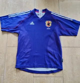 Camiseta original de la Selección Japonesa, clásico modelo del Mundial de Corea de 2002. Desgastado el estampado del escudo y de la manga derecha. Talla S (50x67cm), pero es muy grande, sirve tamabién como M.