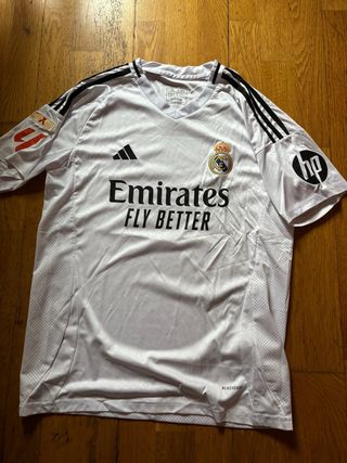 Camiseta de fútbol del Real Madrid. - Diseño clásico en blanco. - Logo de Adidas en negro. - Escudo del Real Madrid. - Patrocinador Emirates Fly Better. - Detalles de las 3 bandas en las mangas. - Logo de HP en la manga derecha. - Insignia de la liga en la manga izquierda.