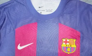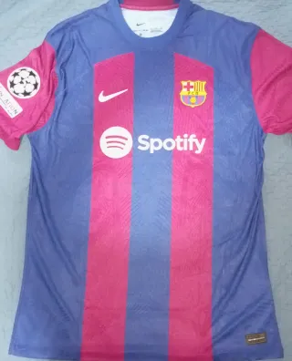 Camiseta del FC Barcelona de la temporada 2023. - Diseño con franjas verticales. - Logo de Spotify en el frontal. - Escudo del club en el pecho. - Parche de la Champions League en la manga.