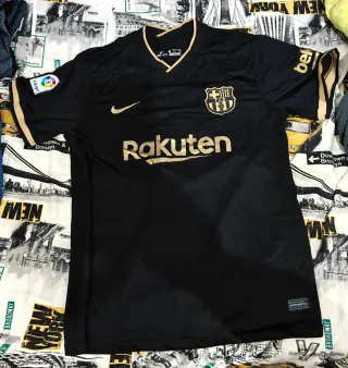 Camiseta negra del FC Barcelona de la temporada 2020-2021. Diseño con detalles dorados. - Logo de Rakuten en dorado. - Escudo del FC Barcelona. - Logo de Nike. - Parche de LaLiga.