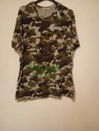 Camiseta con estampado de camuflaje y un diseño gráfico en la parte frontal. - Diseño de bebé con gafas de sol. - Estampado de camuflaje en tonos verdes y marrones. EN LA CAMISETA PONE XXL PERO ES L
