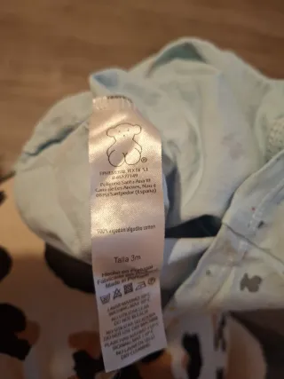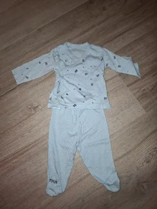 Conjunto de pijama para bebé de la marca Tous. Incluye una camiseta cruzada y un pantalón.3MESES Lavado dos veces,cuando lo compré y otra vez más,luego se le quedó pequeño. - Camiseta con estampado de ositos y estrellas. - Pantalón con pie y estampado de topitos. - Cierre cruzado en la camiseta.
