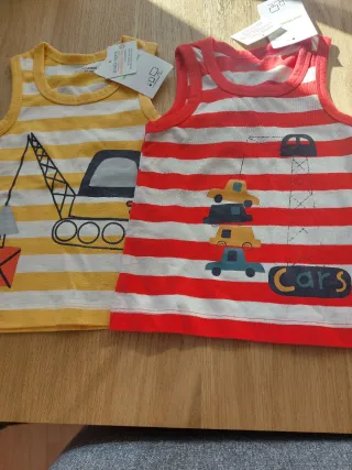 Lote de dos camisetas sin mangas para bebé, talla 2. - Una camiseta a rayas amarillas con dibujo de grúa. - Una camiseta a rayas rojas con dibujo de coches y la palabra Cars.