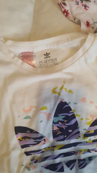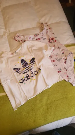 Conjunto de dos prendas de Adidas. - Camiseta blanca con estampado. - Body de bebé con estampado floral.